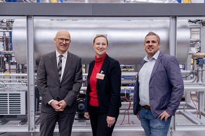 Die rheinland-pfälzische Arbeits- und Transformationsministerin Dörte Schall im Austausch mit KHS-Geschäftsfühler Personal Walter Schön (rechts) und dem Betriebsratsvorsitzenden Mario Paulus, unter anderem über gelebte Mit-bestimmung und die Zukunft des Standorts.